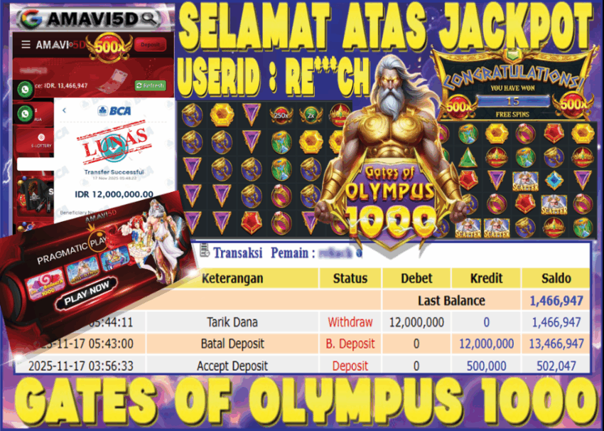 AMAVI5D JACKPOT SLOT GATES OF OLYMPUS 1000 Rp 12.000.000,– LUNAS, SENIN ,17 NOVEMBER 2025 Selamat kepada User id :RE***CH Telah berhasil mendapatkan kemenangan besar pada permainan