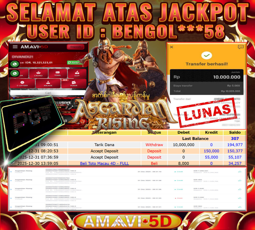 AMAVI5D JACKPOT SLOT ASGARQIAN RISSING Rp10.000.000- RABU, ,31 DESEMBER 2025 Selamat kepada User id : BENGOL***58 Telah berhasil mendapatkan kemenangan besar pada permainan
