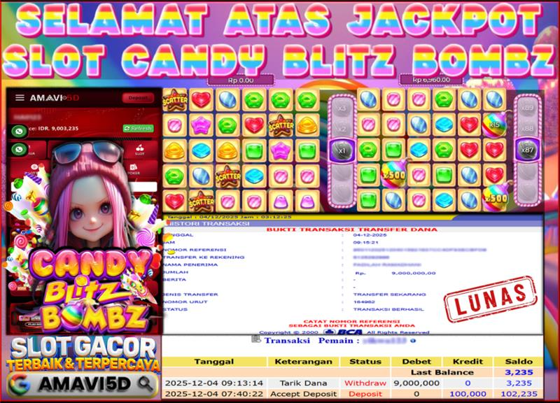 AMAVI5D JACKPOT SLOT CANDY BLITZ BOMBZ Rp 9.000.000- LUNAS, KAMIS,04 DESEMBER 2025 Selamat kepada User id : sany***jf Telah berhasil mendapatkan kemenangan besar pada permainan