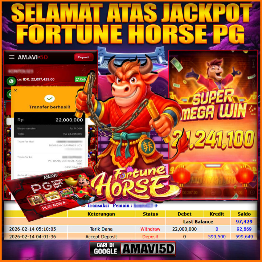 AMAVI5D JACKPOT SLOT FORTUNE HORSE PG Rp22,000.000 – SABTU, 14 FEBRUARI 2026 Selamat kepada User id : RARA***11 Telah berhasil mendapatkan kemenangan besar pada permainan