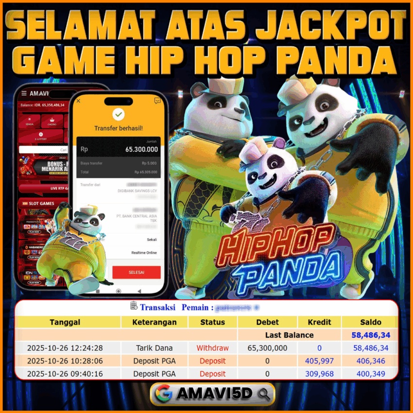 SLOT GAME HIP HOP PANDA kemenangan Sebesar Rp65.300.000, Setelah mengisi formulir withdraw dengan kurung waktu hanya 5 – 10 menit pihak amavi5d sudah melakukan transfer kepada pemilik User id dan dana sudah dapat di cairkan oleh pemenang. Bukti pembayaran yang kami berikan merupakan bukti pembayaran yang SAH / VALID yang langung di dapatkan melaui tanda transfer transaksi dari Bank yang di tuju. Kami mengucapakan banyak Terima Kasih Kepada pemenang karena sudah mempercayakan kami sebagai Bandar Tepercaya yang membayar semua kemenangan member hingga lunas. Masih ragu dengan amavi5d bos ? Di mana bandar togel online sekarang yang terpercaya seperti amavi5d? Bandar yang mengirimkan kemenangan member tanpa bertele – tele. Jadi…. tidak perlu khwatir pada situs amavi5d karena kemenangan anda berapapun akan dibayarakan hingga lunas kepada pemenang.