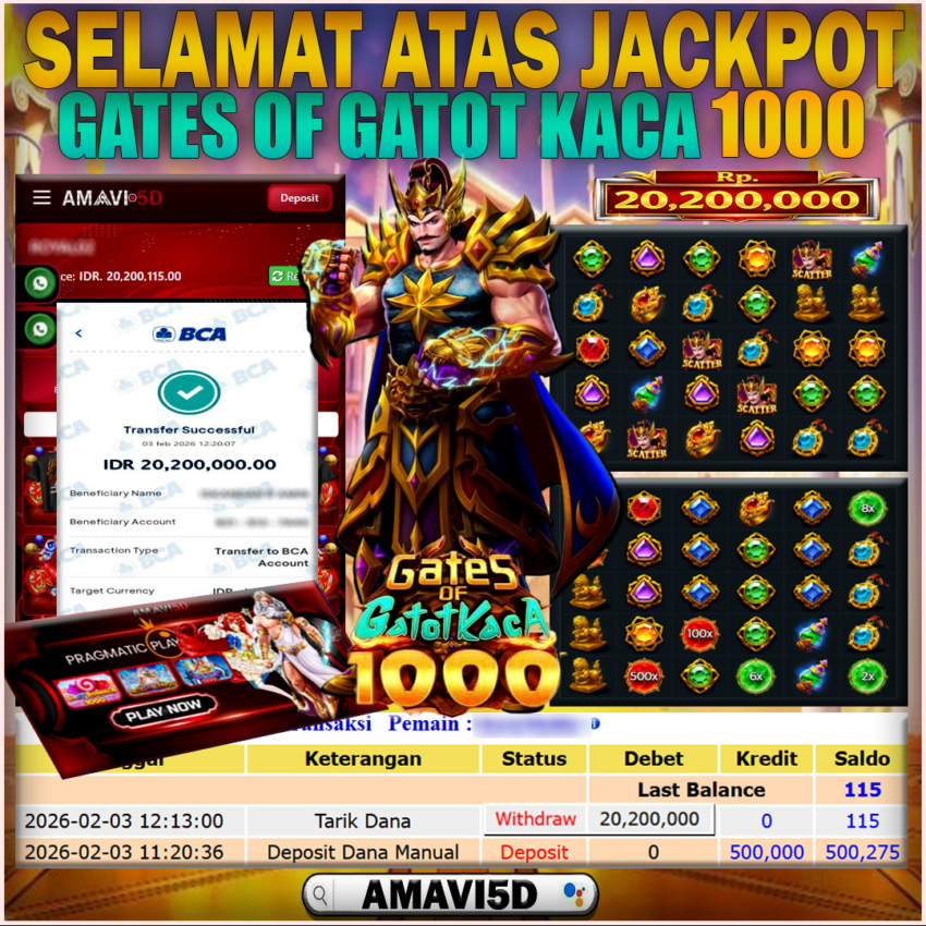 AMAVI5D JACKPOT SLOT GATES OF GATOT KACA 1000 Rp20,200.000 – SELASA , 03 FEBRUARI 2026 Selamat kepada User id : ROM***28 Telah berhasil mendapatkan kemenangan besar pada permainan