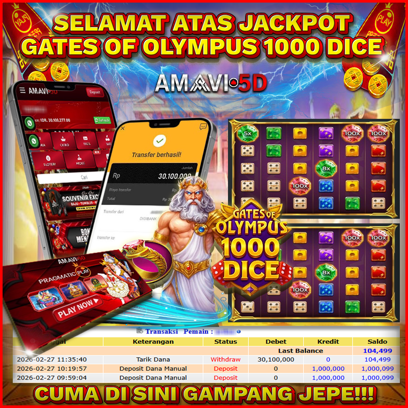 AMAVI5D JACKPOT SLOT GATES OF OLYMPUS 1000 DICE Rp30,100.000 – JUMAT, 27 FEBRUARI 2026 Selamat kepada User id : BO***59 Telah berhasil mendapatkan kemenangan besar pada permainan