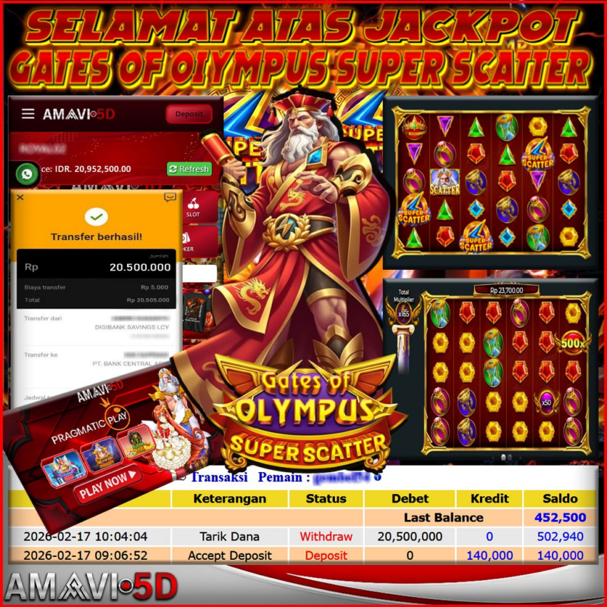 SLOT GATES OF OLYMPUS SUPER SCATTER kemenangan Sebesar Rp20,500.000, Setelah mengisi formulir withdraw dengan kurung waktu hanya 5 – 10 menit pihak amavi5d sudah melakukan transfer kepada pemilik User id dan dana sudah dapat di cairkan oleh pemenang. Bukti pembayaran yang kami berikan merupakan bukti pembayaran yang SAH / VALID yang langung di dapatkan melaui tanda transfer transaksi dari Bank yang di tuju. Kami mengucapakan banyak Terima Kasih Kepada pemenang karena sudah mempercayakan kami sebagai Bandar Tepercaya yang membayar semua kemenangan member hingga lunas. Masih ragu dengan amavi5d bos ? Di mana bandar togel online sekarang yang terpercaya seperti amavi5d? Bandar yang mengirimkan kemenangan member tanpa bertele – tele. Jadi…. tidak perlu khwatir pada situs amavi5d karena kemenangan anda berapapun akan dibayarakan hingga lunas kepada pemenang