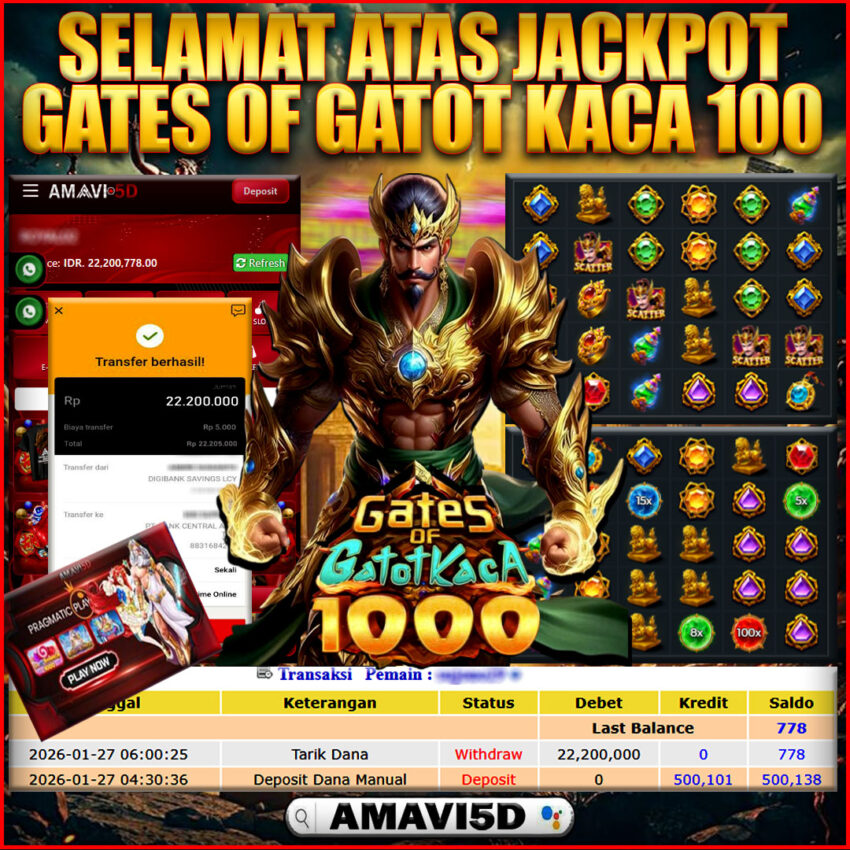 AMAVI5D JACKPOT SLOT GATES OF GATOT KACA 1000 Rp22,200.000 – SELASA ,27 JANUARY 2026 Selamat kepada User id : RONI***11 Telah berhasil mendapatkan kemenangan besar pada permainan