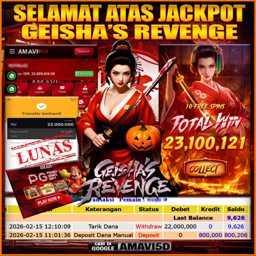 AMAVI5D JACKPOT SLOT GEISHA’S REVENGE Rp22,000.000 – MINGGU, 15 FEBRUARI 2026 Selamat kepada User id : BED***55 Telah berhasil mendapatkan kemenangan besar pada permainan