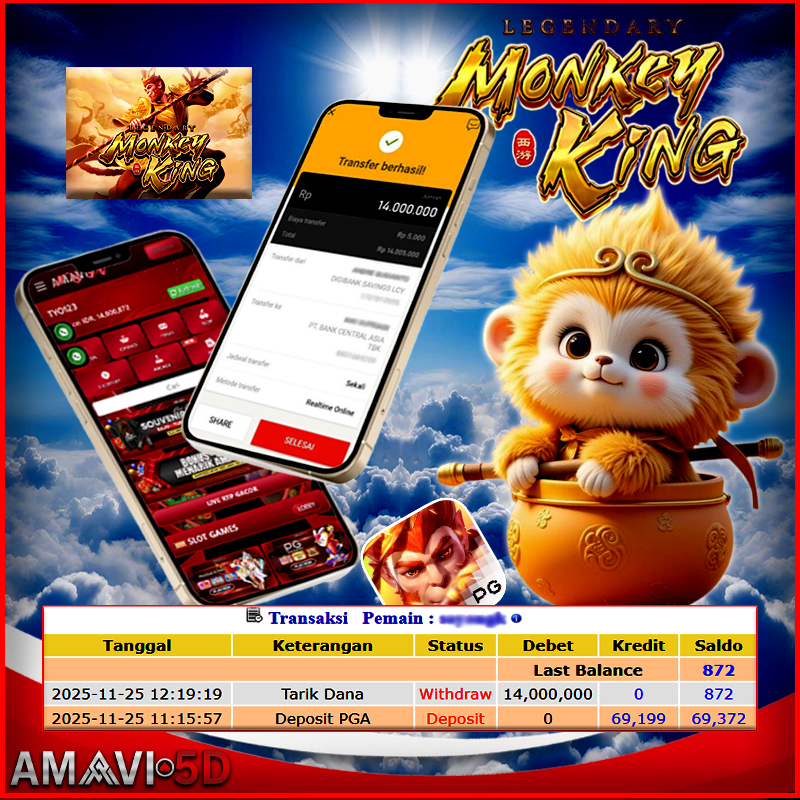 AMAVI5D SLOT LEGENDARY MONGKEY KING Rp 14.000.000,– LUNAS,SELASA ,25 NOVEMBER 2025 Selamat kepada User id : Jor**945 Telah berhasil mendapatkan kemenangan besar pada permainan