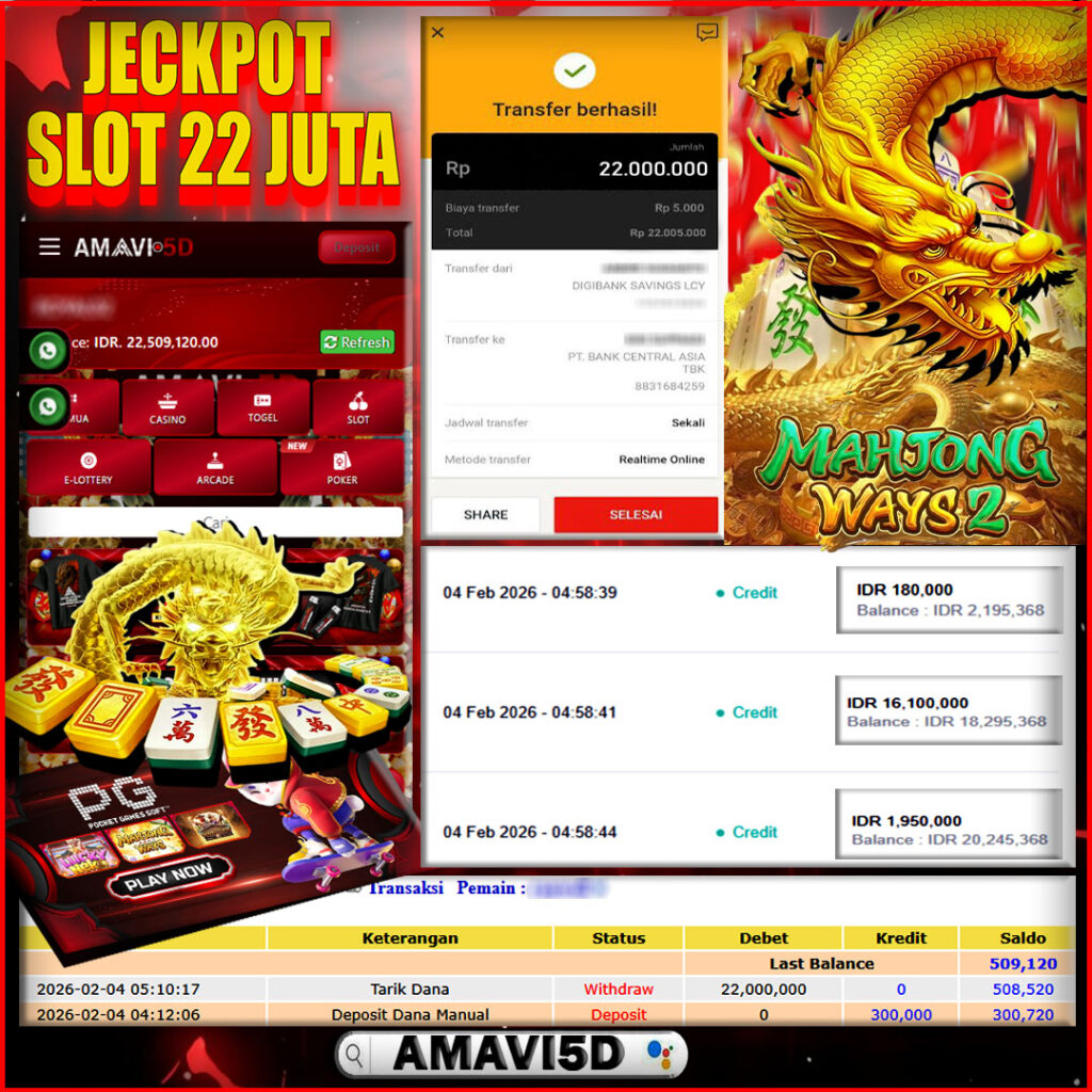 AMAVI5D JACKPOT SLOT MAHJONG WAYS 2 Rp22,000.000 – RABU, 04 FEBRUARI 2026 Selamat kepada User id : LENTI***111 Telah berhasil mendapatkan kemenangan besar pada permainan