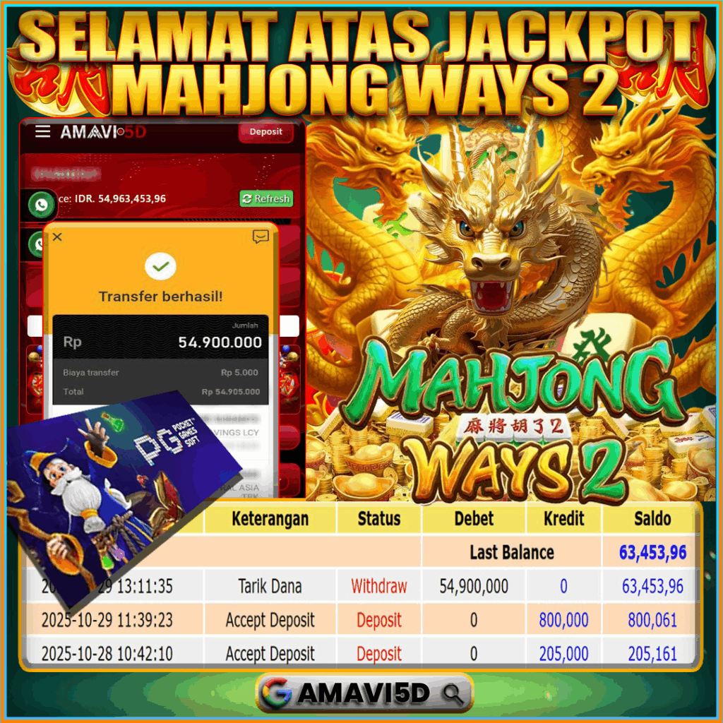 AMAVI5D JACKPOT SLOT MAHJONG WAYS 2Rp 54.900.000,- LUNAS, RABU , 29 OKTOBER 2025Selamat kepada User id : AET**54 Telah berhasil mendapatkan kemenangan besar pada permainan