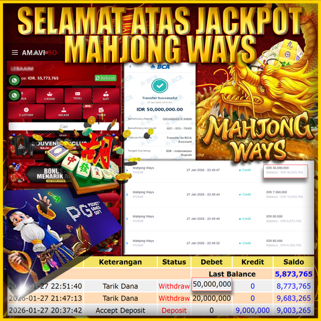 AMAVI5D JACKPOT SLOT MAHJONG WAYS Rp50,000.000 – SELASA ,27 JANUARY 2026 Selamat kepada User id : JOSS***12 Telah berhasil mendapatkan kemenangan besar pada permainan