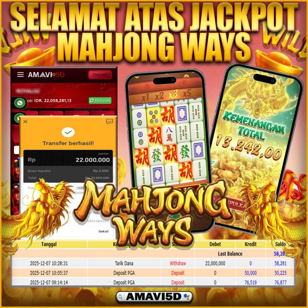 AMAVI5D JACKPOT SLOT MAHJONG WAYS Rp 22.000.000- LUNAS, SAPTU ,06 DESEMBER 2025 Selamat kepada User id :serl***s Telah berhasil mendapatkan kemenangan besar pada permainan