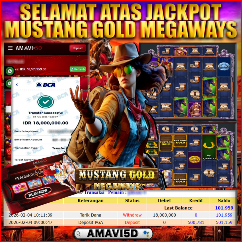 AMAVI5D JACKPOT SLOT MUSTANG GOLD MEGAWAYS Rp18,000.000 – RABU, 04 FEBRUARI 2026 Selamat kepada User id : JEK***55 Telah berhasil mendapatkan kemenangan besar pada permainan