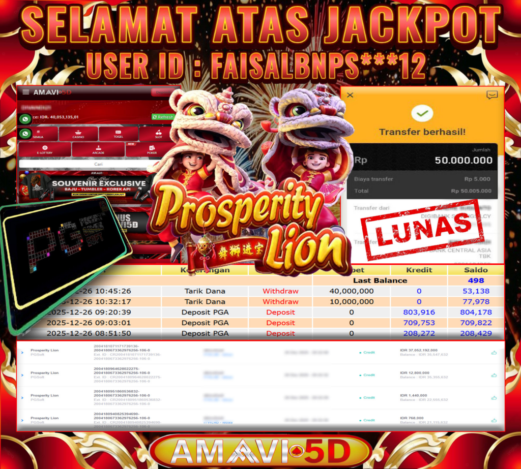 AMAVI5D JACKPOT SLOT PROSPERITY LION Rp50.000.000- JUM,AT, ,26 DESEMBER 2025 Selamat kepada User id : FAISALBNPS***12 Telah berhasil mendapatkan kemenangan besar pada permainan
