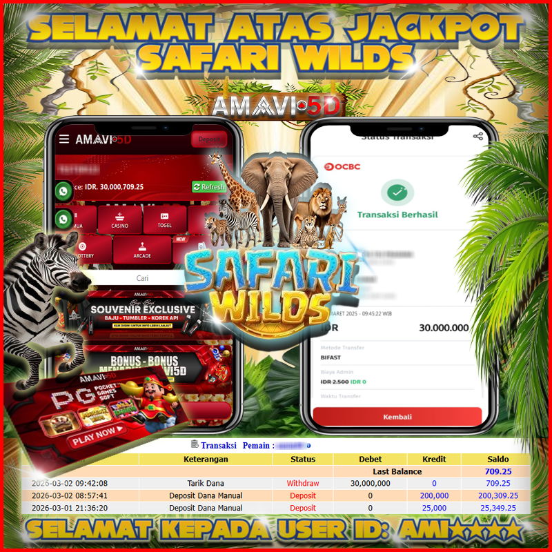 AMAVI5D JACKPOT SLOT SAFARI WILDS Rp30,000.000 – SENIN, 02 MARET 2026 Selamat kepada User id : AMI**** Telah berhasil mendapatkan kemenangan besar pada permainan