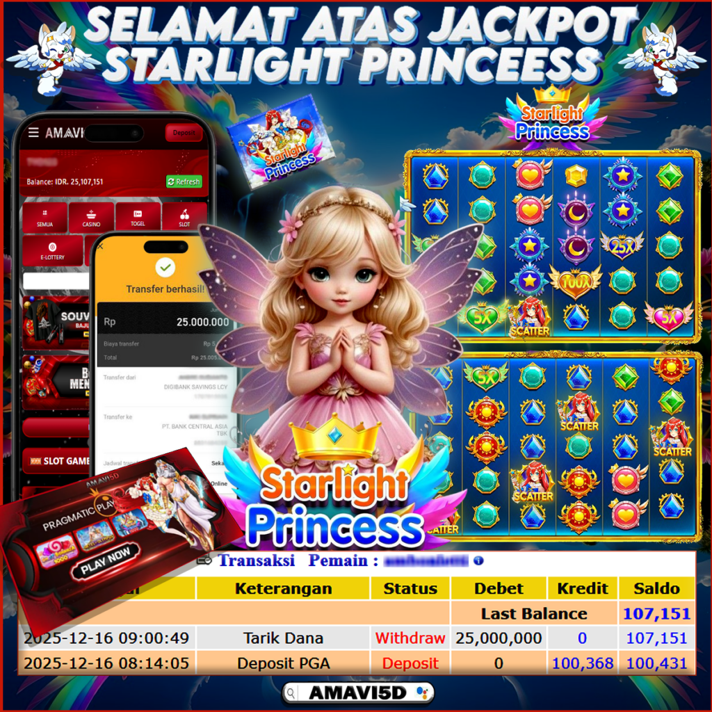 AMAVI5D JACKPOT SLOT STARLIGHT PRINCESS Rp 25.000.000- LUNAS, SELASA,16 DESEMBER 2025 Selamat kepada User id :uny***12Telah berhasil mendapatkan kemenangan besar pada permainan