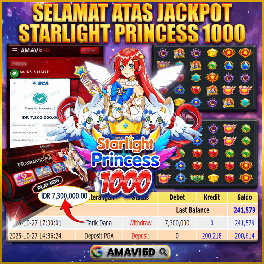 AMAVI5D JACKPOT SLOT STARLINGHT PRINCESS1000 Rp 7.300.000,- LUNAS, SENIN , 27 OKTOBER 2025Selamat kepada User id : SANU***86 Telah berhasil mendapatkan kemenangan besar pada permainan
