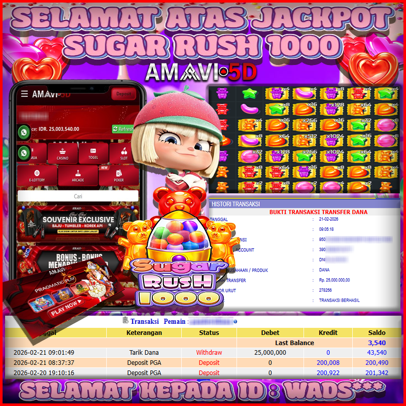 AMAVI5D JACKPOT SLOT SUGAR RUSH 1000 Rp25,000.000 – SABTU, 21 FEBRUARI 2026 Selamat kepada User id : WADS***03 Telah berhasil mendapatkan kemenangan besar pada permainan