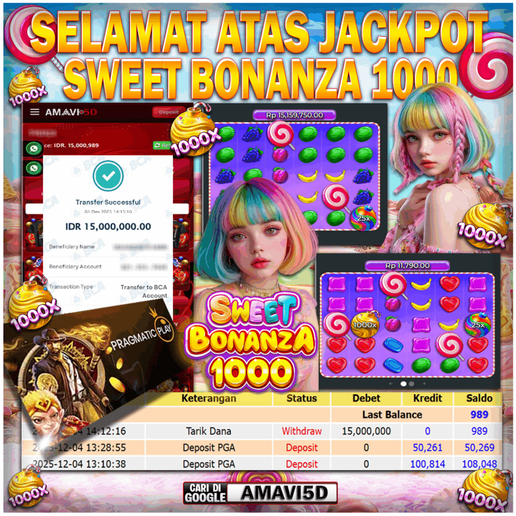 AMAVI5D JACKPOT SLOT SWEET BONANZA 1000 Rp 15.000.000- LUNAS, KAMIS,04 DESEMBER 2025 Selamat kepada User id :CIM****77 Telah berhasil mendapatkan kemenangan besar pada permainan
