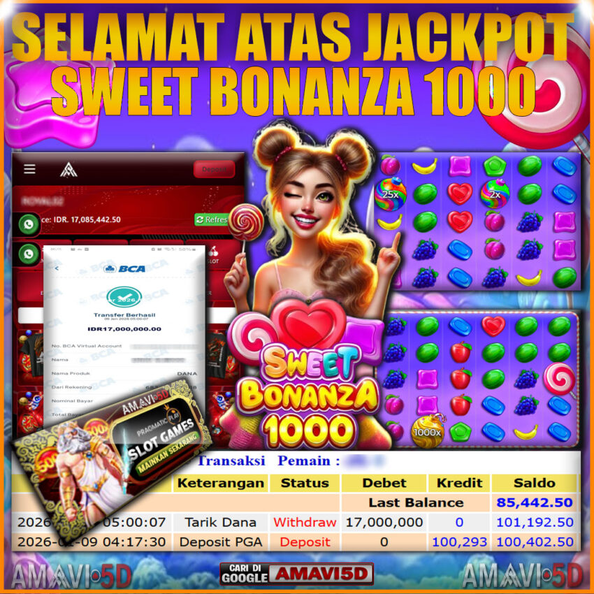 AMAVI5D JACKPOT SLOT SWEET BONANZA 1000 Rp17,000.000- JUMAT ,09JANUARY 2026 Selamat kepada User id : SIDIK****SN Telah berhasil mendapatkan kemenangan besar pada permainan