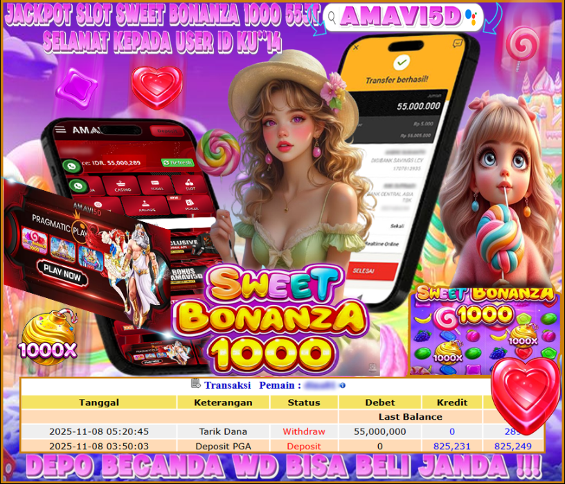 AMAVI5D JACKPOT SLOT SWEET BONANZA 1000 Rp 55.000.000,- LUNAS, SAPTU, 08 NOVEMBER 2025 Selamat kepada User id :KU**14 Telah berhasil mendapatkan kemenangan besar pada permainan