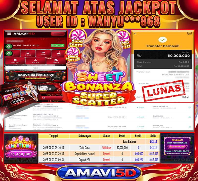 AMAVI5D JACKPOT SLOT SWEET BONANZA SUPER SCATTER Rp50,000.000- SABTU ,03 JANUARY 2026 Selamat kepada User id :WAHYU***868 Telah berhasil mendapatkan kemenangan besar pada permainan