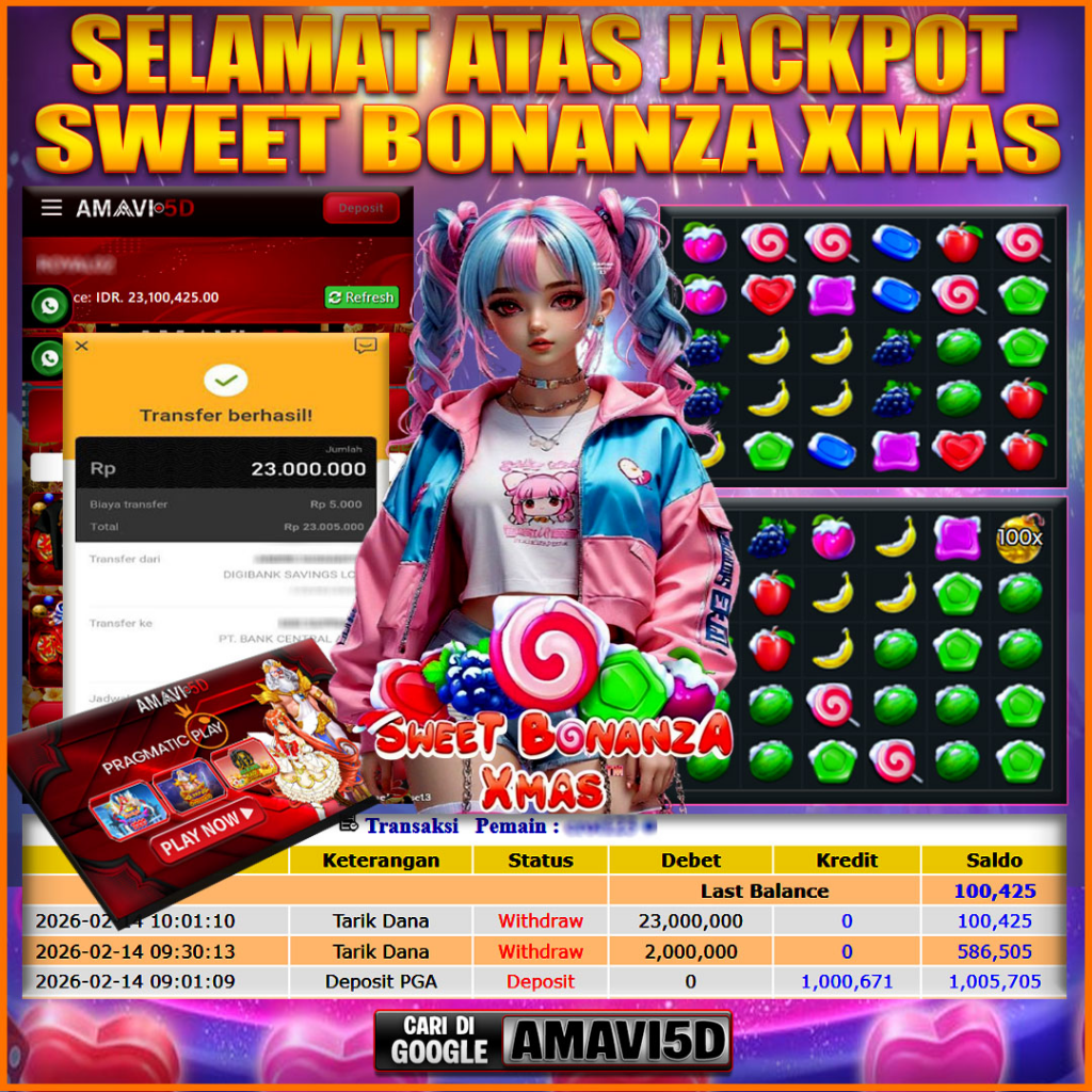 AMAVI5D JACKPOT SLOT SLOT SWEET BONANZA XMAS Rp23,000.000 – SABTU, 14 FEBRUARI 2026 Selamat kepada User id : BOY***79 Telah berhasil mendapatkan kemenangan besar pada permainan