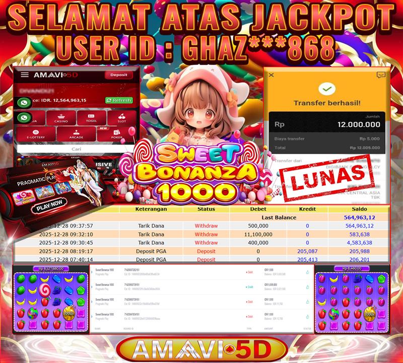 AMAVI5D JACKPOT SLOT SWEET BONANZA1000 Rp12.000.000- MINGGU, ,28 DESEMBER 2025 Selamat kepada User id :GHAZ***868 Telah berhasil mendapatkan kemenangan besar pada permainan