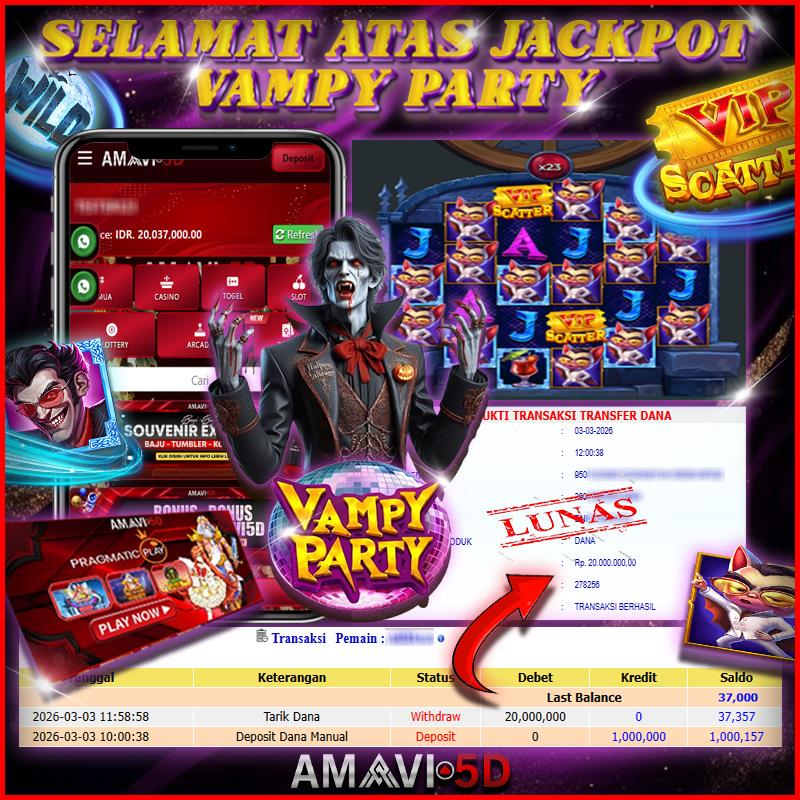 AMAVI5D JACKPOT SLOT VAMPY PARTY Rp20,000.000 – SELASA, 03 MARET 2026 Selamat kepada User id : MAS***88 Telah berhasil mendapatkan kemenangan besar pada permainan