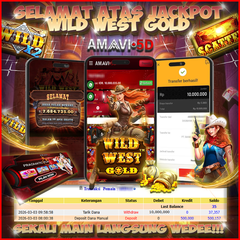 AMAVI5D JACKPOT SLOT WILD WEST GOLD Rp10,000.000 – SELASA, 03 MARET 2026 Selamat kepada User id : WIW***44 Telah berhasil mendapatkan kemenangan besar pada permainan
