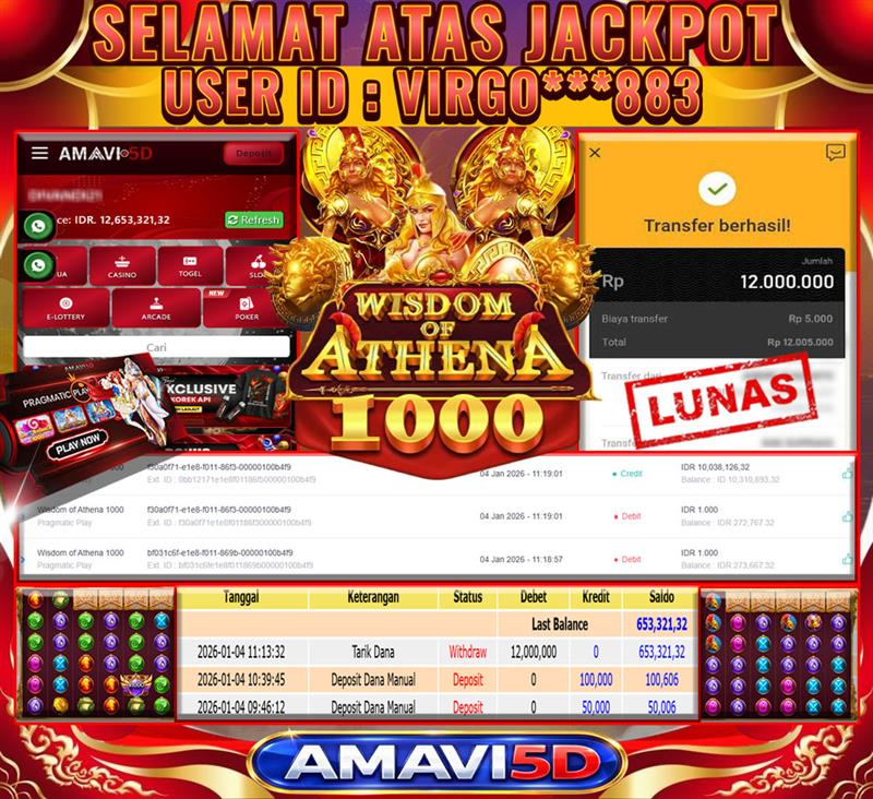 AMAVI5D JACKPOT SLOT WISDOM OF ATHENA 1000 Rp12,000.000- MINGGU ,04 JANUARY 2026 Selamat kepada User id : VIRGO**883 Telah berhasil mendapatkan kemenangan besar pada permainan