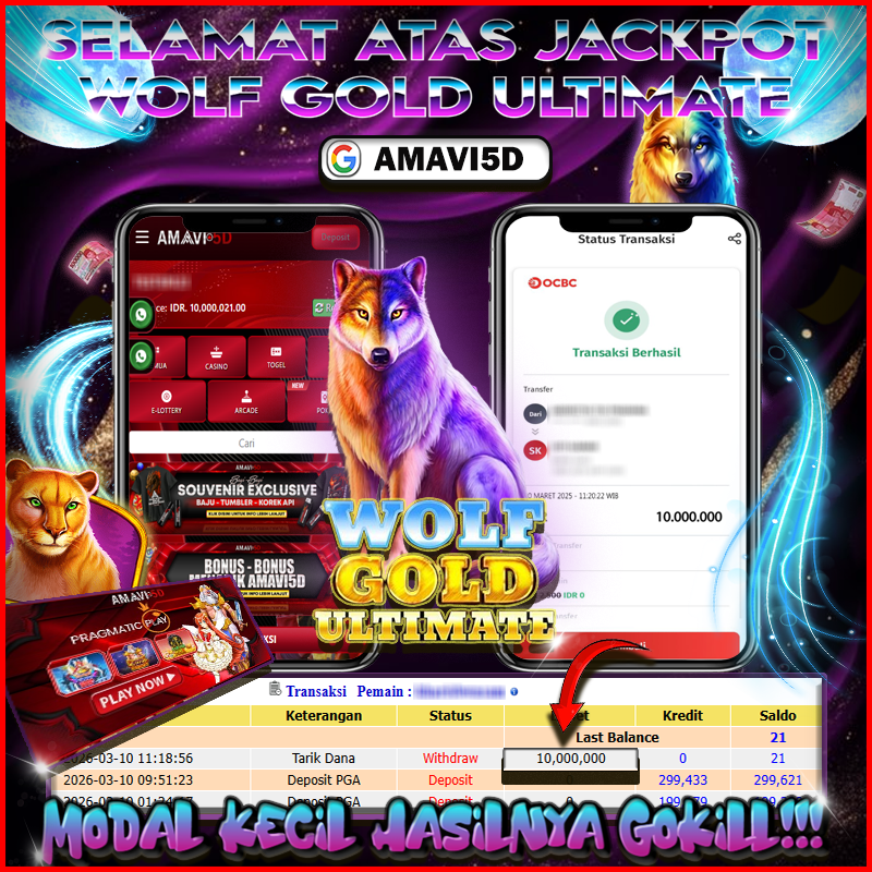 AMAVI5D JACKPOT SLOT WOLF GOLD ULTIMATE Rp10,000.000 – SELASA, 10 MARET 2026 Selamat kepada User id : YAI***02 Telah berhasil mendapatkan kemenangan besar pada permainan