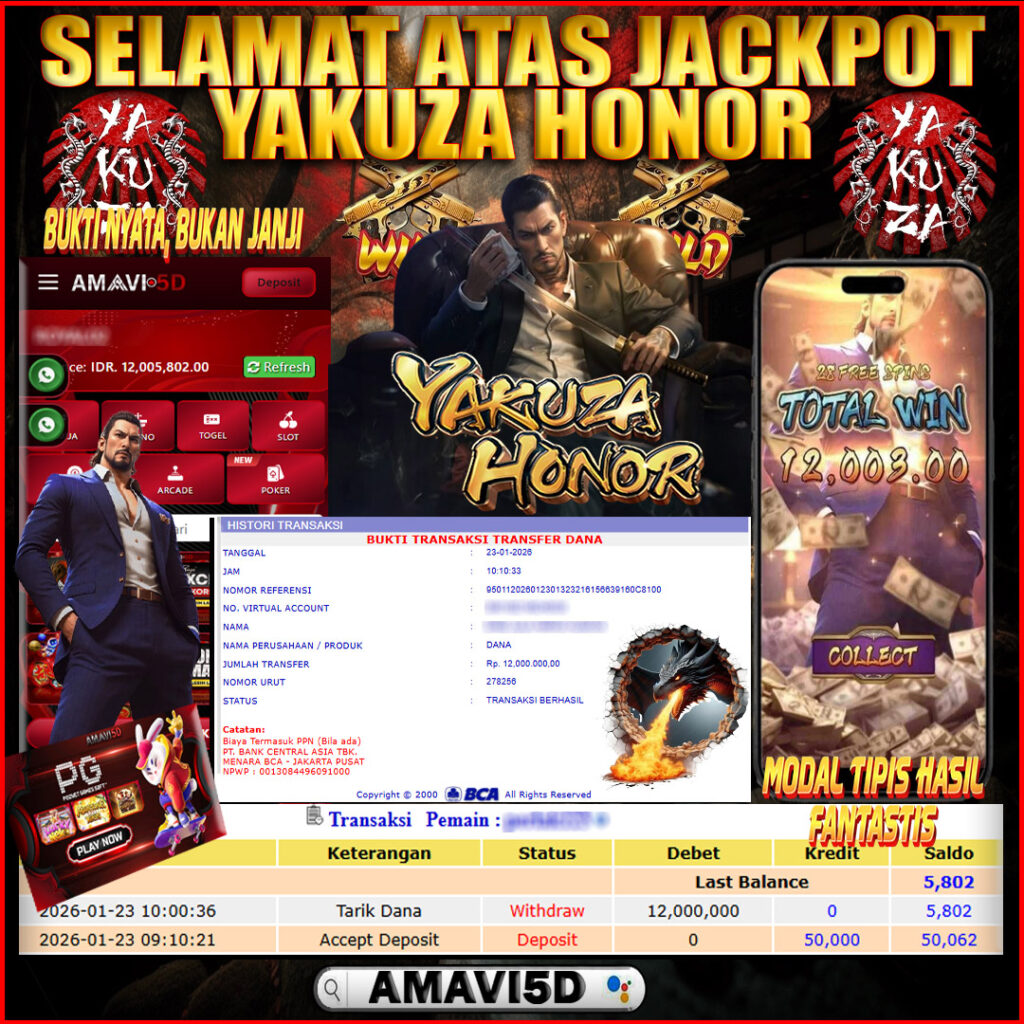 SLOT YAKUZA HONOR kemenangan Sebesar Rp12,000.000, Setelah mengisi formulir withdraw dengan kurung waktu hanya 5 – 10 menit pihak amavi5d sudah melakukan transfer kepada pemilik User id dan dana sudah dapat di cairkan oleh pemenang. Bukti pembayaran yang kami berikan merupakan bukti pembayaran yang SAH / VALID yang langung di dapatkan melaui tanda transfer transaksi dari Bank yang di tuju. Kami mengucapakan banyak Terima Kasih Kepada pemenang karena sudah mempercayakan kami sebagai Bandar Tepercaya yang membayar semua kemenangan member hingga lunas. Masih ragu dengan amavi5d bos ? Di mana bandar togel online sekarang yang terpercaya seperti amavi5d? Bandar yang mengirimkan kemenangan member tanpa bertele – tele. Jadi…. tidak perlu khwatir pada situs amavi5d karena kemenangan anda berapapun akan dibayarakan hingga lunas kepada pemenang