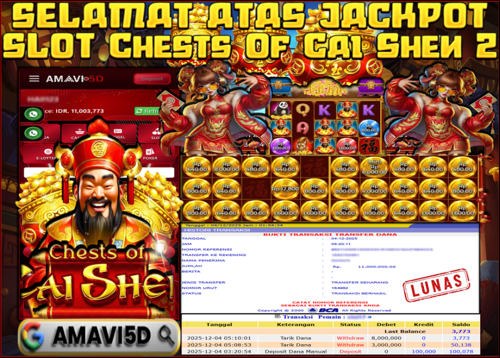 AMAVI5D JACKPOT SLOT CHESTS OF CAI SHEN 2 Rp 11.000.000- LUNAS, KAMIS,04 DESEMBER 2025 Selamat kepada User id : jick**14 Telah berhasil mendapatkan kemenangan besar pada permainan