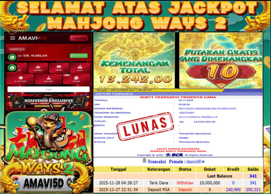 AMAVI5D JACKPOT SLOT MAHJONG WAYS 2 Rp 19.000.000,– LUNAS, JUMAT ,28 NOVEMBER 2025 Selamat kepada User id :pra**ta22 Telah berhasil mendapatkan kemenangan besar pada permainan