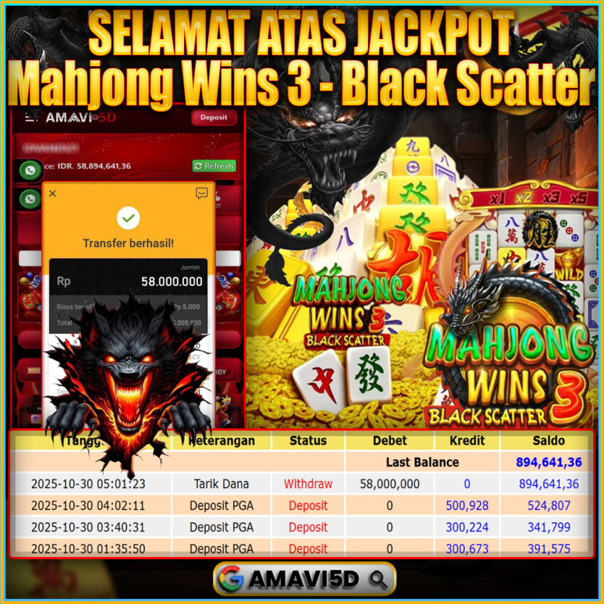 AMAVI5D JACKPOT SLOT MAHJONG WINS 3 -BLACK SCATTER Rp 58.000.000,- LUNAS, KAMIS , 30 OKTOBER 2025Selamat kepada User id : CUN***54 Telah berhasil mendapatkan kemenangan besar pada permainan