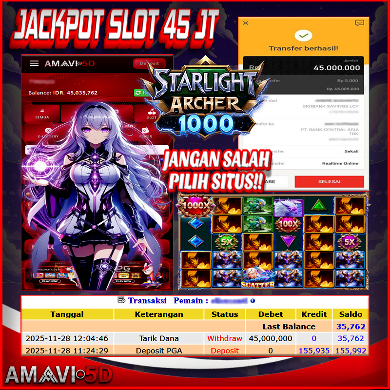 AMAVI5D JACKPOT SLOT STARLIGHT ARCHER 1000 Rp 45.000.000,– LUNAS, JUMAT ,28 NOVEMBER 2025 Selamat kepada User id :yog**i11 Telah berhasil mendapatkan kemenangan besar pada permainan