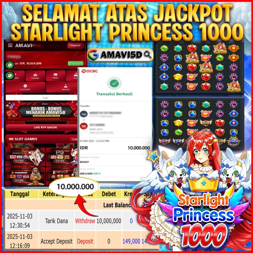 AMAVI5D JACKPOT SLOT Starlight Princess 1000 Rp 10.000.000,- LUNAS, SENIN, 03 NOVEMBER 2025Selamat kepada User id :am***1988 Telah berhasil mendapatkan kemenangan besar pada permainan