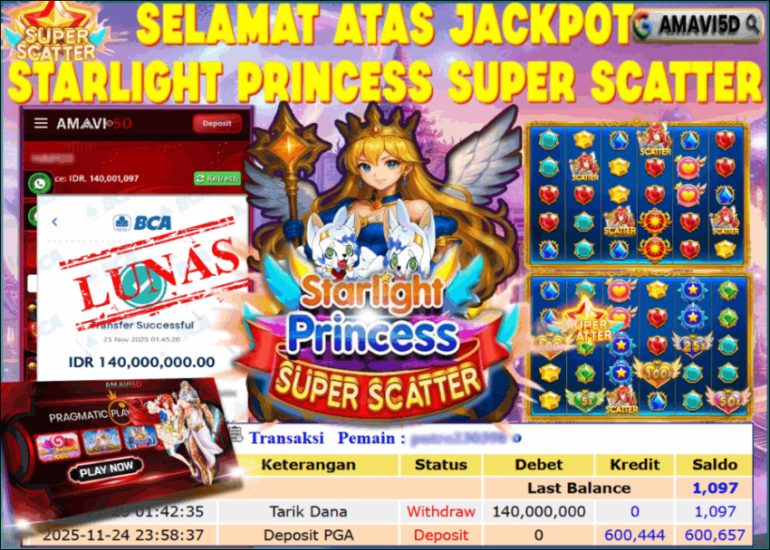 AMAVI5D SLOT STARLIGHT PRINCESS SUPER SCATTER Rp 140.000.000,– LUNAS,SELASA ,25 NOVEMBER 2025 Selamat kepada User id : Bag***25 Telah berhasil mendapatkan kemenangan besar pada permainan