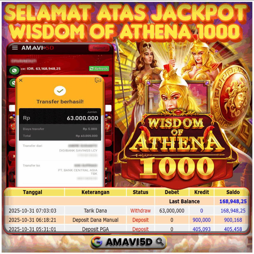 SLOT WISDOM OF ATHENA 1000 kemenangan Sebesar Rp63.000.000, Setelah mengisi formulir withdraw dengan kurung waktu hanya 5 – 10 menit pihak amavi5d sudah melakukan transfer kepada pemilik User id dan dana sudah dapat di cairkan oleh pemenang. Bukti pembayaran yang kami berikan merupakan bukti pembayaran yang SAH / VALID yang langung di dapatkan melaui tanda transfer transaksi dari Bank yang di tuju. Kami mengucapakan banyak Terima Kasih Kepada pemenang karena sudah mempercayakan kami sebagai Bandar Tepercaya yang membayar semua kemenangan member hingga lunas. Masih ragu dengan amavi5d bos ? Di mana bandar togel online sekarang yang terpercaya seperti amavi5d? Bandar yang mengirimkan kemenangan member tanpa bertele – tele. Jadi…. tidak perlu khwatir pada situs amavi5d karena kemenangan anda berapapun akan dibayarakan hingga lunas kepada pemenang.