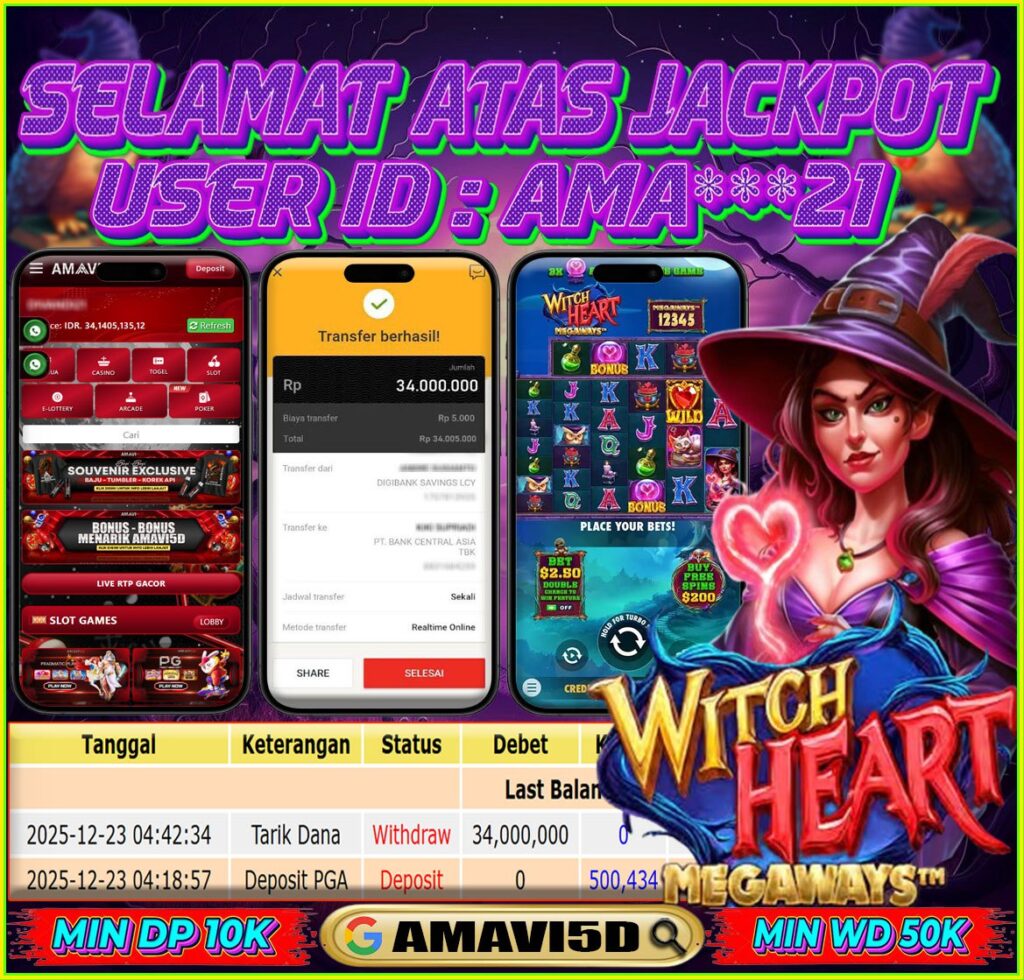 AMAVI5D JACKPOT SLOT WITCH HEART MEGAWAYS Rp34.000.000- LUNAS, SELASA ,23 DESEMBER 2025 Selamat kepada User id : AMA**21 Telah berhasil mendapatkan kemenangan besar pada permainan